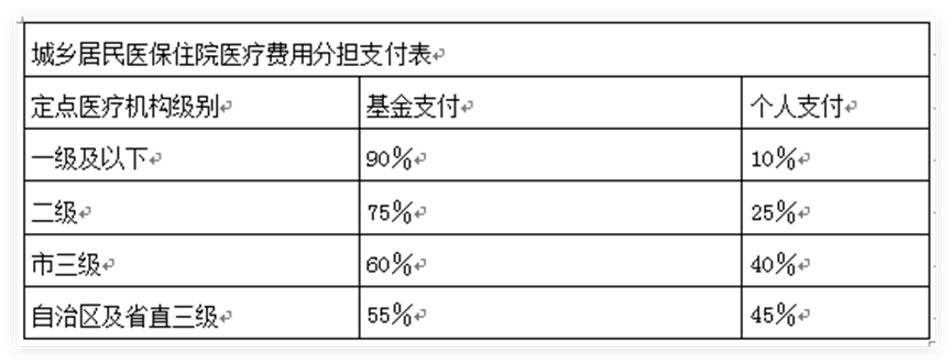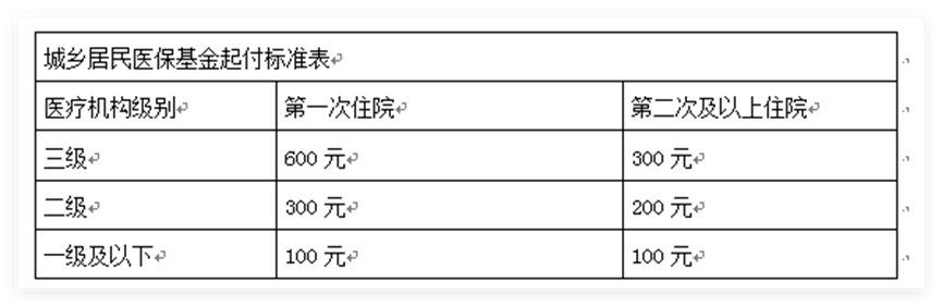 一、城乡居民医保统筹基金起付标准如下表,从符合基金支付总额中扣除。
