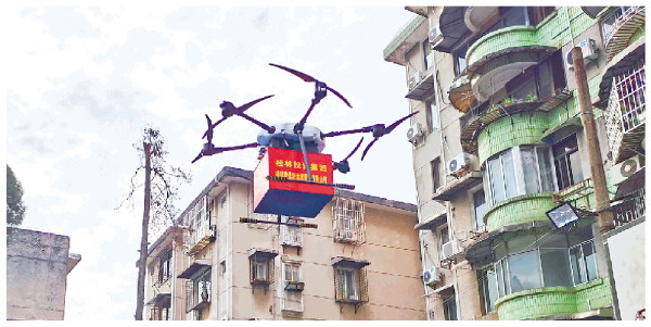 在桂林市低空医疗配送试飞仪式上,搭载着医疗药品的小型无人机起飞。记者徐莹波 摄