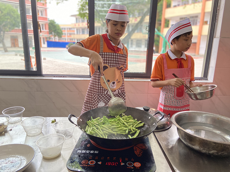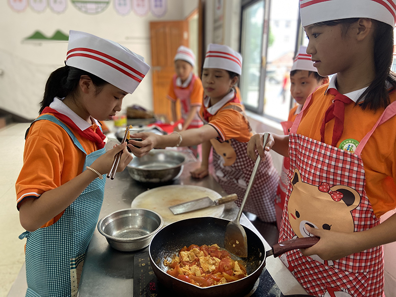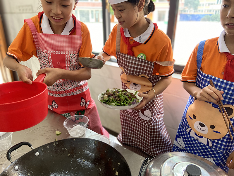 孩子们清洗完蔬菜,准备自己动手制作美食。切菜,放油,翻炒,加料,稚嫩的小手拿着锅铲,手法熟稔,俨然一副小厨师的模样,做菜的程序一样没落下,在孩子们的通力合作下,色香味俱全的菜便出锅了。从播种、栽苗、施肥、除草到开花结果,再到采摘、清洗、做菜,孩子们全程参与,看着这一盘劳动的果实,他们都急不可耐,忍不住开始品尝了起来。