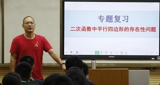 平行四边形的存在性问题,是中考的热点也是难点,考查的知识点覆盖范围广、综合性强。郑剑锋副校长着重于引导学生分类讨论、数形结合的数学思想,将这类问题总结成2种题型--即“三定一动”和“两定两动”,并通过探索帮助学生总结解决这类问题的基本步骤为“分类——画图——计算”。课堂上,郑剑锋副校长带领学生复习相关知识点,从“三定一动”到“两定两动”由浅入深,给学生充足的时间体验画图过程,同时重视启发和归纳总结。整堂课数学味浓厚,教师启发到位,学生紧跟思路并敢于表达自己的发现。