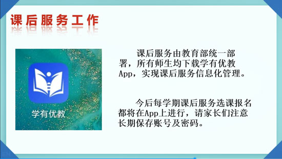 徐燕汇报了“双减”下的学校教育教学成效和教育质量的保障措施,进行课后服务、控辍保学和国家教育政策的宣传。国家教育政策宣传的内容包括“五项管理”、“双减”以及《家庭教育促进法》等。与家长交流了新学期制定学习目标和计划、复习巩固以及亲子阅读等准备工作。