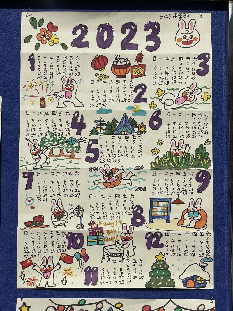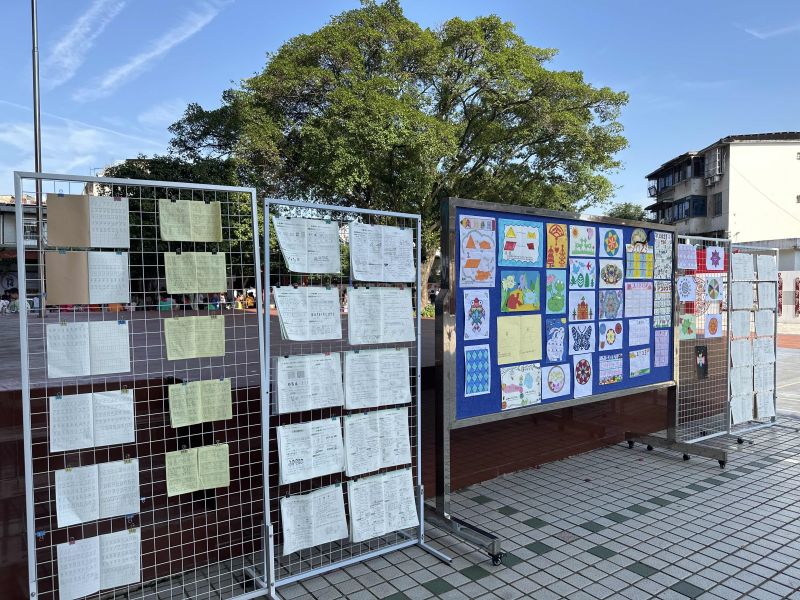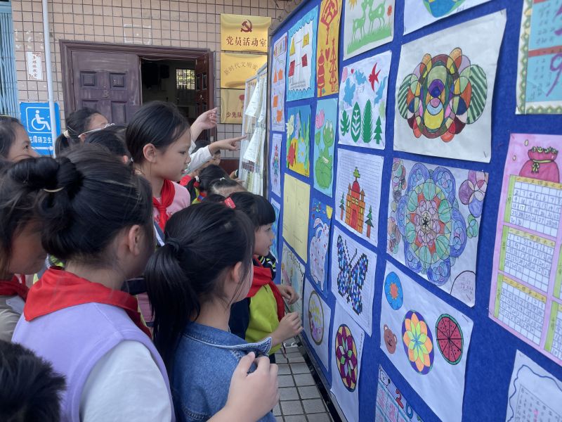 学校在教学楼前设置专门的展板,展示数学基础性作业和实践性作业。同学们的作业内容丰富多样,有数字书写、乘法口诀、解决问题、玩转轴对称图形、精美的日历、探究图形内角和、玩转方格图、巧搭“牙签桥”等,既有“数学味”又有“趣味性”。