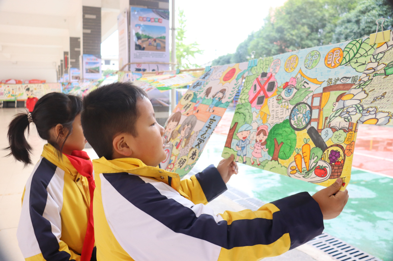 在学校架空层,赵洁玲为三、四年级的学生讲述了如何保护自己的眼睛,通过科学讲解、生动描述,告诉学生眼睛是心灵的窗户,在小学阶段是眼睛生长发育最重要的时期,要坚持户外活动,认真做好每天两次眼保健操,端正读书写字坐姿,同时让同学们自编特色护眼操缓解视疲劳等。结合“双减”行动,让学生明确写作业的时间要与护外活动时间相融合,随后,让学生观看绘画和手抄报,丰富多彩的作品让学生近距离地了解近视防控要从我做起。