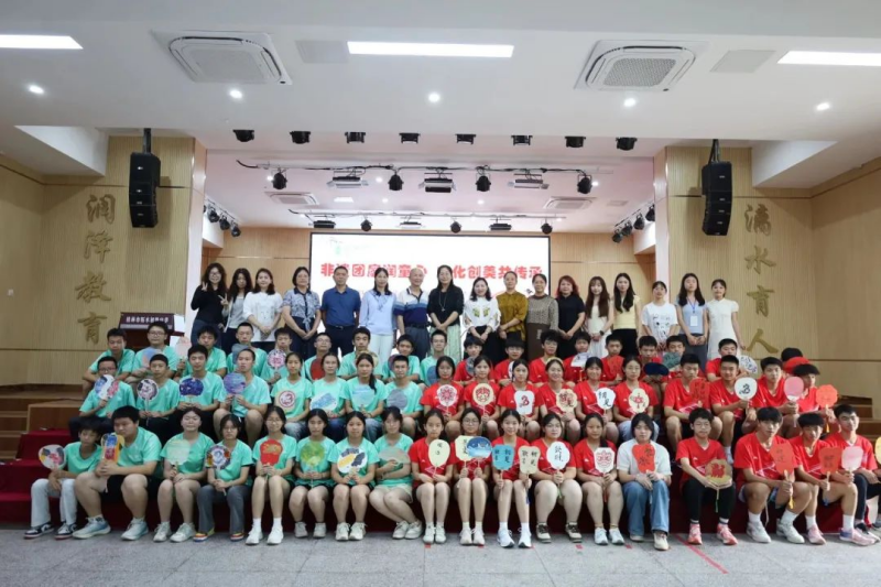 5月23日,为积极响应“双减”政策,进一步丰富学生课余生活,促进学生全面发展,桂林市第十一中学来到桂林市柘木初级中学,开展了以“非遗团扇润童心 文化创美共传承” 为主题的新时代文明志愿服务活动。此次活动旨在通过非遗文化的浸润,为“双减”政策下的校园生活注入更多文化活力,让学生在轻松愉快的氛围中感受传统文化的魅力。桂林市第十一中学校领导蒋朝国、潘宇、粟芳,校外合作机构代表及广西师范大学美术学院在桂林市第十一中学的实习生代表,共同为桂林市柘木初级中学的学生们带来了这场别开生面的六一儿童节新时代文明志愿服务活动。