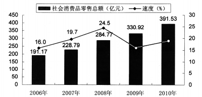 2006-2010年社会消费品零售总额及增长速度