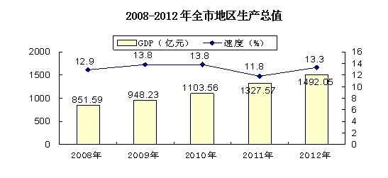 初步核算,全市地区生产总值1492.05亿元,按可比价格计算,比上年增长13.3%。其中,第一产业增加值274.51亿元,增长6.6%;第二产业增加值694.94亿元,增长18.9%;第三产业增加值522.60亿元,增长9.2%。第一产业增加值占地区生产总值的比重为18.4%,第二产业增加值比重为46.6%,第三产业增加值比重为35.0%。