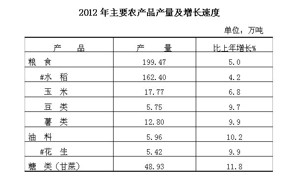 全年农作物总播种面积67.92万公顷,增长2.6%。其中,粮食播种面积37.79万公顷,增长1.2%;经济作物播种面积6.40万公顷,增长8.1%;其他作物播种面积23.72万公顷,增长3.5%。在稳定粮食生产的基础上,非粮作物播种面积继续扩大。主要农产品产量稳定增长。全年粮食总产量199.47万吨,增长5.0%。水果总产量307.37万吨,增长8.6%;蔬菜产量356.05万吨,增长4.7%。