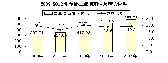 全部工业总产值1821.59亿元,比上年增长22.6%。工业增加值583.03亿元,按可比价计算增长19.3%。工业增加值占GDP的比重为39.1%。其中,规模以上工业总产值1587.44亿元,增长25.6%;规模以上工业增加值494.81亿元,增长24.5%。在规模以上工业增加值中,国有及国有控股企业增长12.3%,股份制企业增长27.4%,外商及港澳台商投资企业增长4.4%。从轻重工业看,重工业增长26.9%,轻工业增长21.1%。从行业看,在32个工业行业大类中有28个行业增长,占行业面的87.5%。