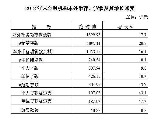 年末金融机构本外币存款余额1829.93亿元,比年初增加275.04亿元,增长17.7%。本外币贷款余额1053.15亿元,比年初增加145.93亿元,增长16.1%。