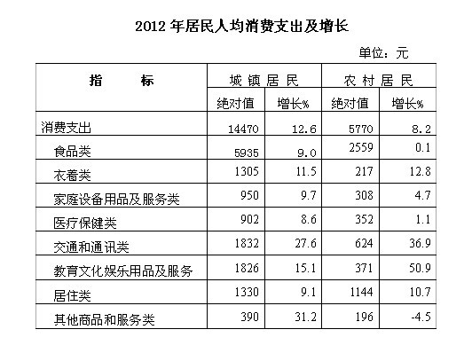 城镇居民人均可支配收入22300元,比上年增长12.2%。其中,工资性收入增长11.9%,转移性收入增长13.9%,经营性收入增长10.7%,财产性收入下降0.1%。人均消费性支出14470元,增长12.6%。城镇居民食品消费支出占消费总支出的比重为41.0%。农村居民人均纯收入7328元,比上年增长15.9%,农村居民食品消费支出占消费总支出的比重为44.4%。