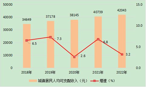 图8 2018- 2022年城镇居民人均可支配收入及增长速度