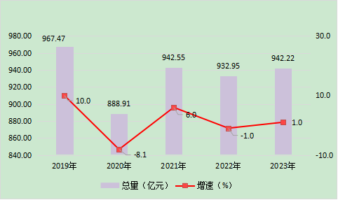 全年社会消费品零售总额942.22亿元,比上年增长1.0%,按经营单位所在地分,城镇消费品零售额781.12亿元,增长0.8%;乡村消费品零售额161.10亿元,增长2.1%。按消费类型分,餐饮收入130.70亿元,增长1.7%;商品零售811.52亿元,增长0.9%。