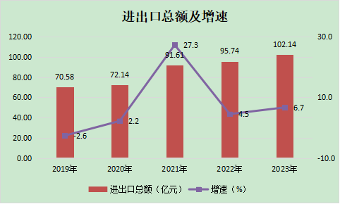 全年外贸进出口总额102.14亿元,比上年增长6.7%。其中,出口92.32亿元,增长4.4%;进口9.81亿元,增长33.5%。