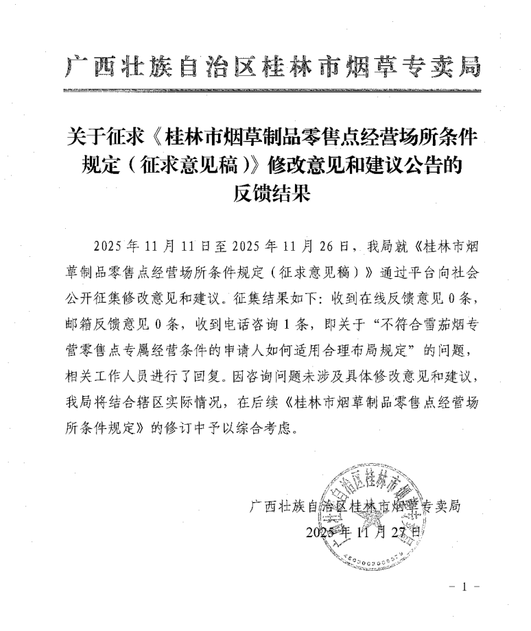 桂林市烟草专卖局关于征求《桂林市烟草制品零售点经营场所条件规定(征求意见稿)》修改意见和建议公告的结果