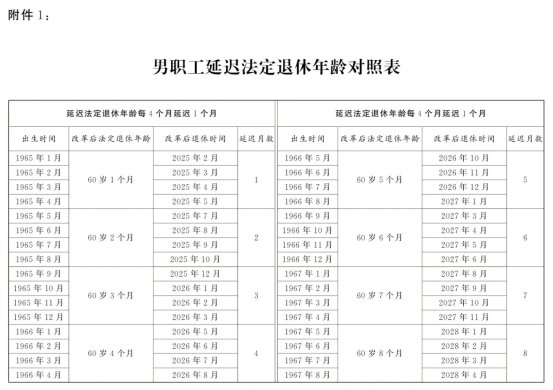 附件:1.男职工延迟法定退休年龄对照表2.原法定退休年龄五十五周岁的女职工延迟法定退休年龄对照表3.原法定退休年龄五十周岁的女职工延迟法定退休年龄对照表4.提高最低缴费年限情况表