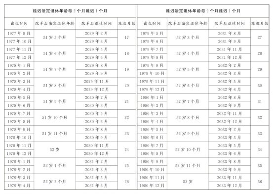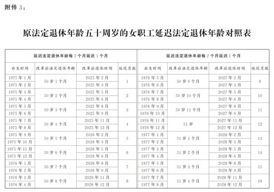 第一条 从2025年1月1日起,男职工和原法定退休年龄为五十五周岁的女职工,法定退休年龄每四个月延迟一个月,分别逐步延迟至六十三周岁和五十八周岁;原法定退休年龄为五十周岁的女职工,法定退休年龄每二个月延迟一个月,逐步延迟至五十五周岁。国家另有规定的,从其规定。