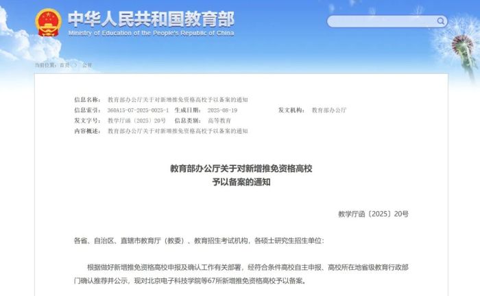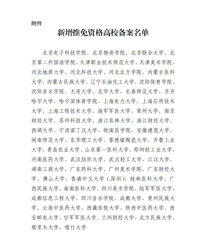 根据做好新增推免资格高校申报及确认工作有关部署,经符合条件高校自主申报、高校所在地省级教育行政部门确认推荐并公示,现对北京电子科技学院等67所新增推免资格高校予以备案。