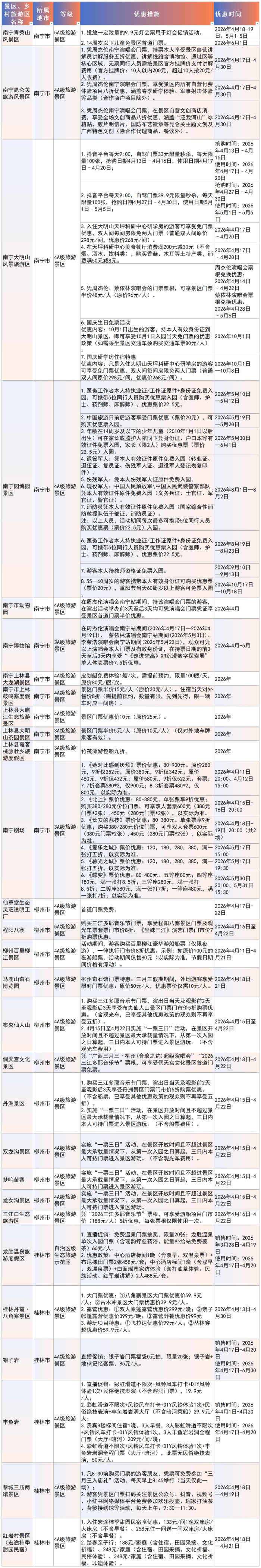 除常规门票优惠外,多地还推出“票根通用”“节会联动”等特色福利。在南宁,昆仑关、大明山、动物园等景区,游客凭周杰伦等演唱会门票票根,即可享受门票或购物优惠;在柳州,程阳八寨、布央仙人山、丹洲等景区,游客购买三江多耶音乐节门票,可享受相应门票折扣。此外,钦州、河池等地景区也纷纷发力,分别针对中甲联赛、走坡音乐节、南丹音乐节等活动,推出免门票或折扣福利。