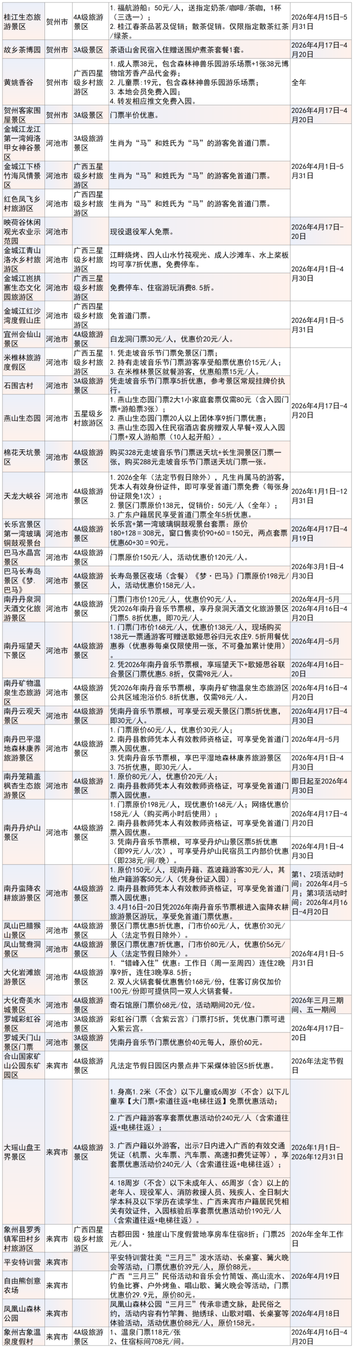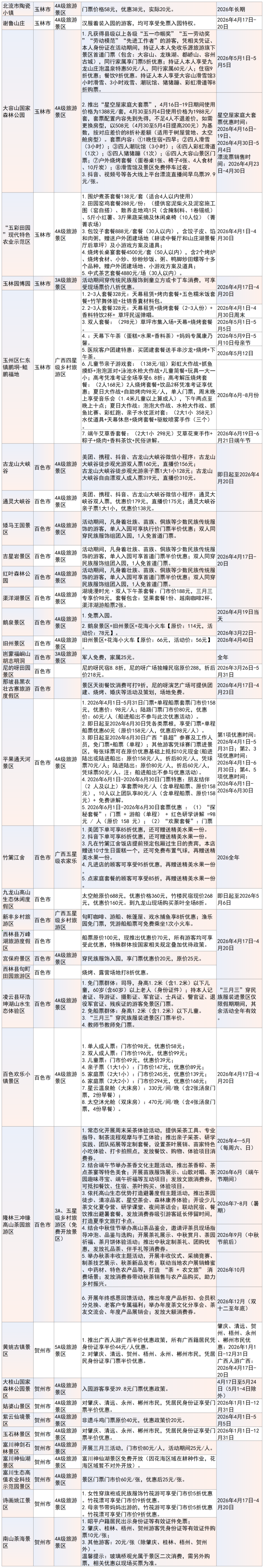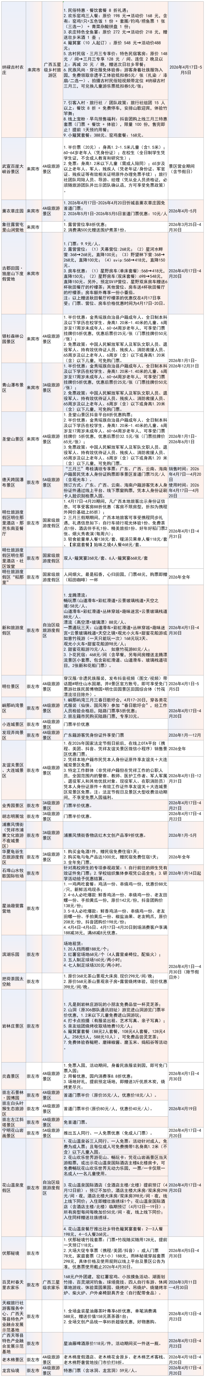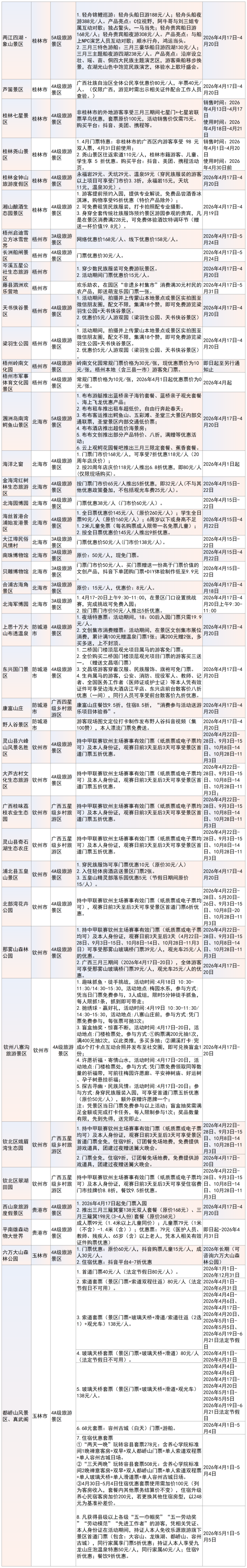 门票减免是本次优惠活动的重点内容之一。如北海南珠博物馆将于4月15日至22日实行免门票政策;崇左德天跨国瀑布景区推出“三月三”粤桂滇琼专享票、宁明花山岩画景区则实行“五人同行一人免票”政策,鼓励游客结伴出游。