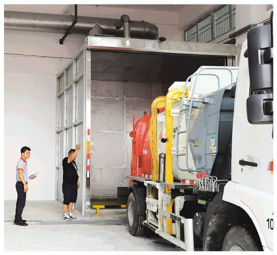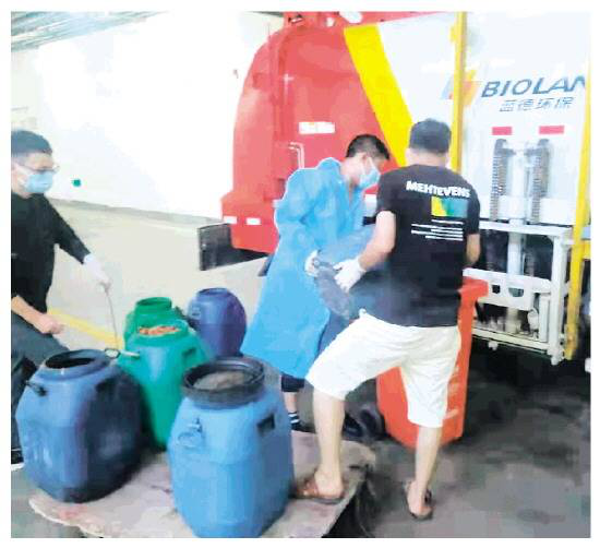 (工作人员正在对餐厨垃圾收运车进行卸料)