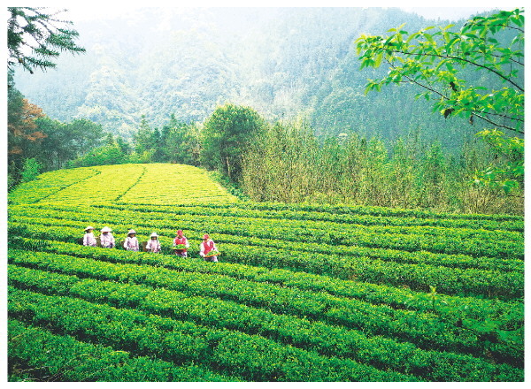 村民与驻村工作队员一起采摘茶叶。 陆仕臣 摄
