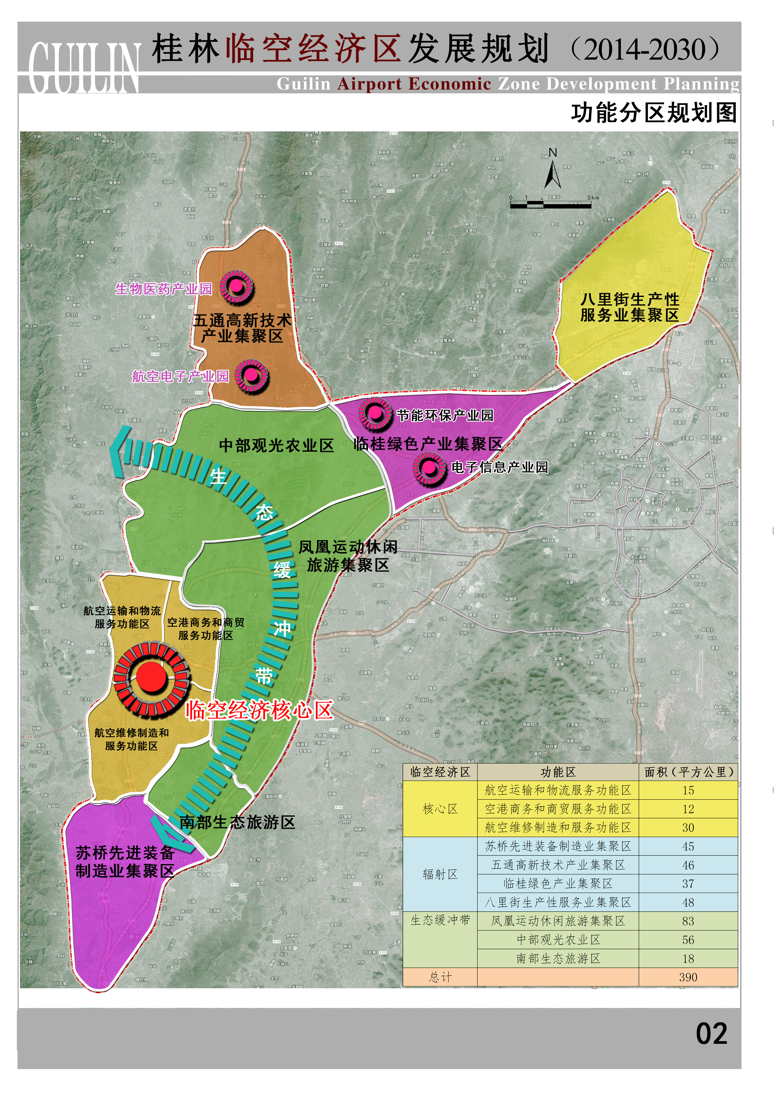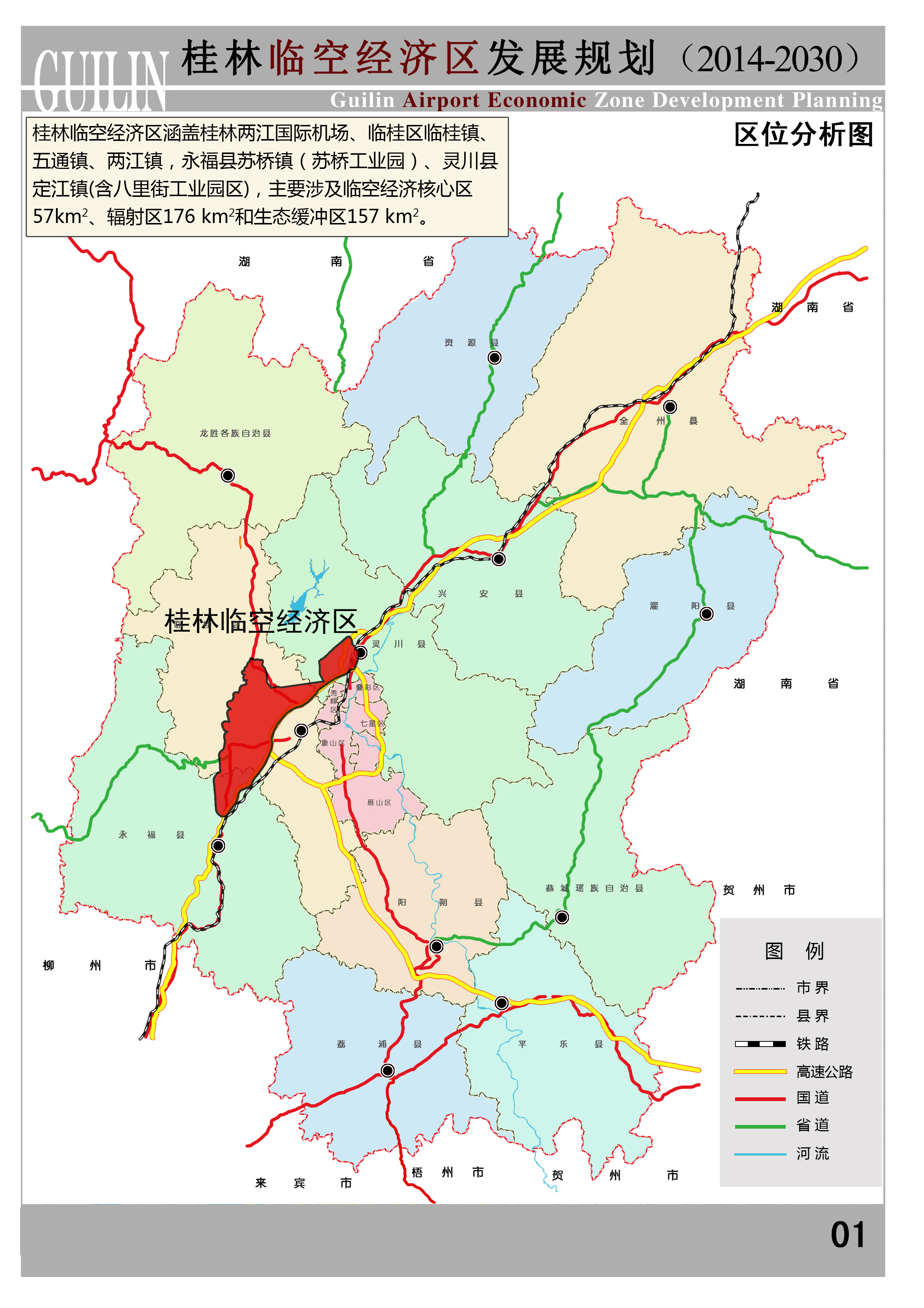 桂林临空经济区涵盖桂林两江国际机场,临桂区临桂镇、五通镇、两江镇,永福县苏桥镇(苏桥工业园)和灵川县定江镇(含八里街工业园区),主要涉及临空经济核心区57km2、辐射区176 km2和生态缓冲带157 km2。