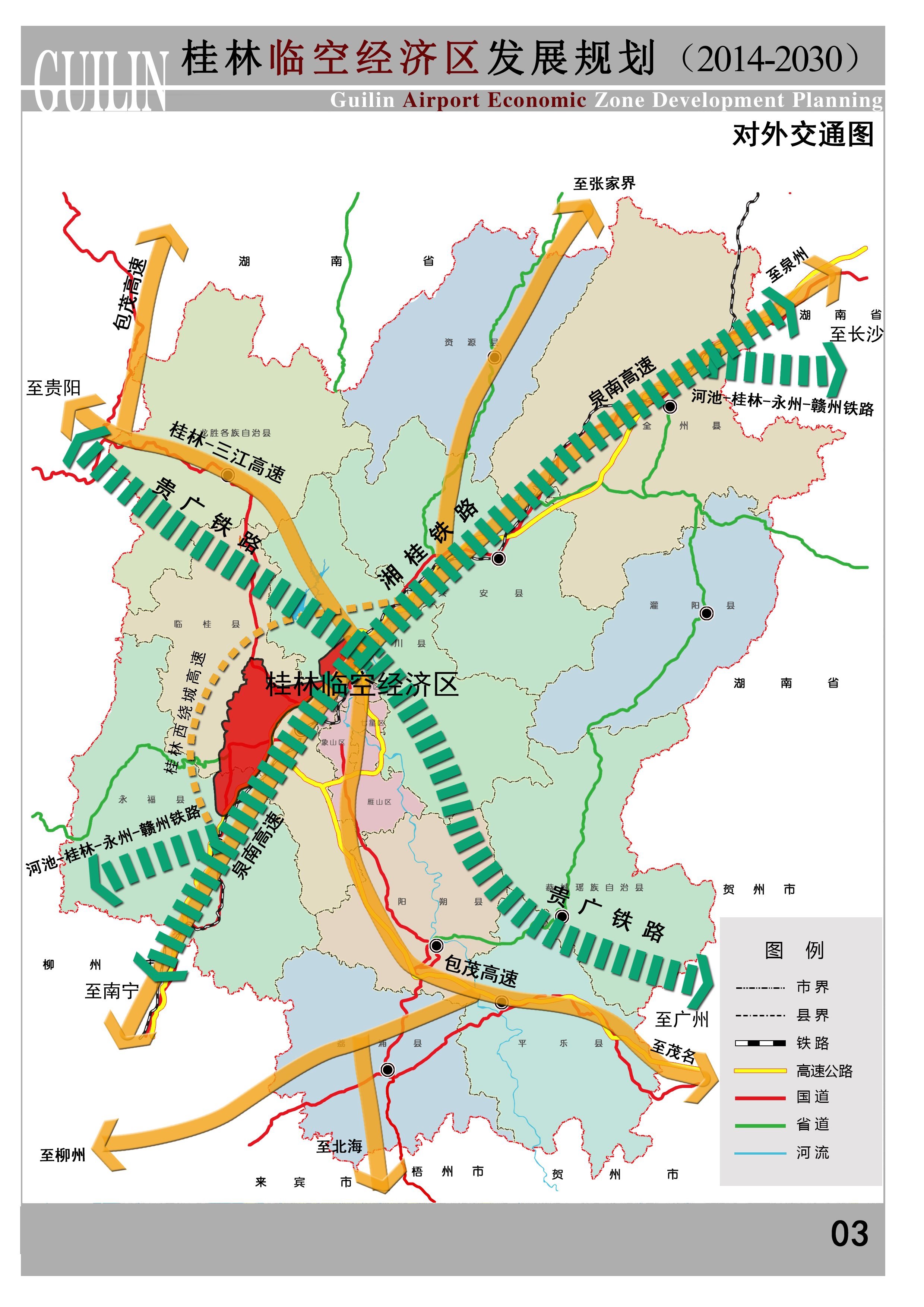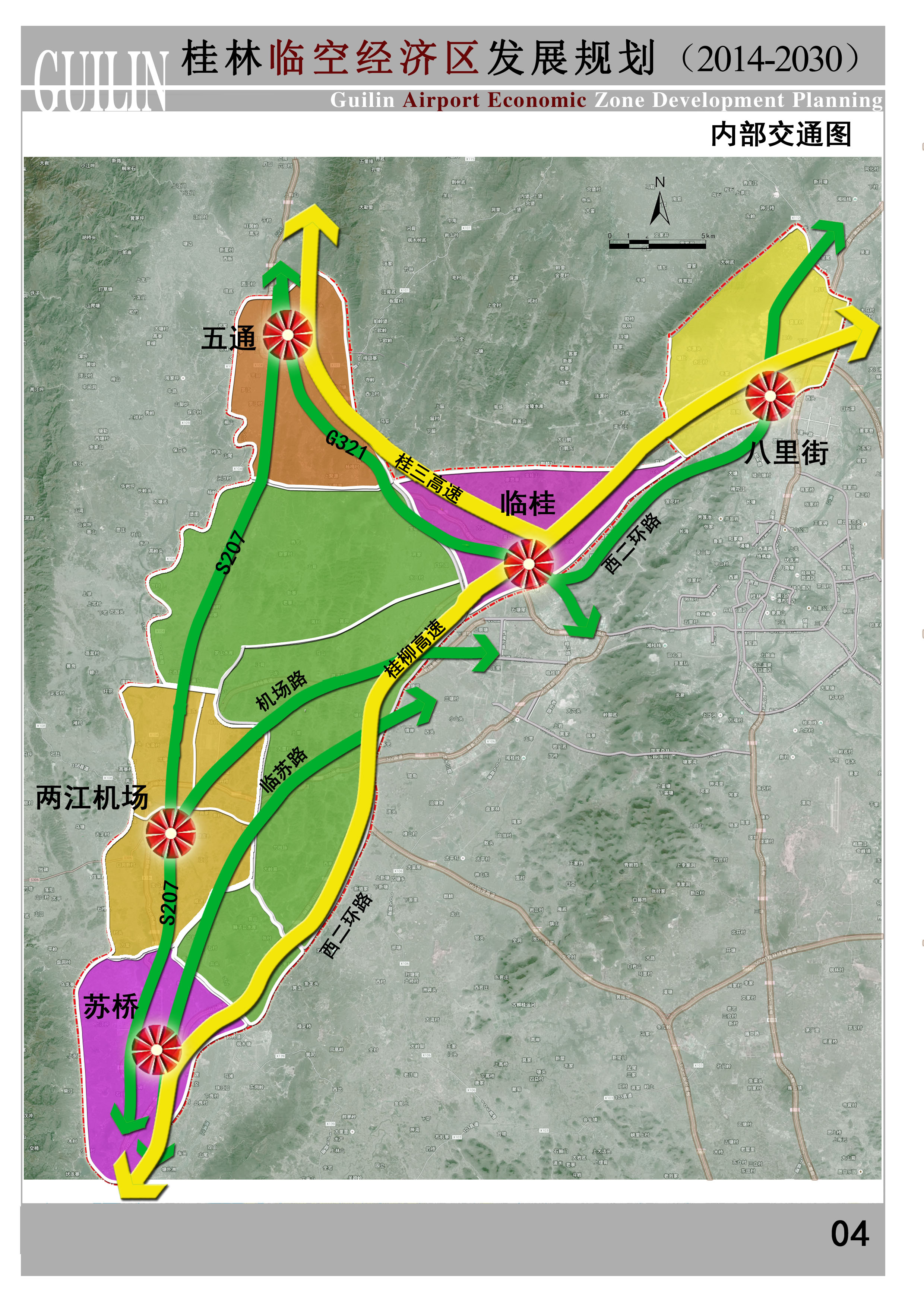 以机场为中心,加快推进临空经济区内部路网建设,形成以高速路为主体,一般城市道路、轨道交通并存的综合交通运输通道,联系桂林主城区和两江国际机场周边的产业园区、商业区等功能区。