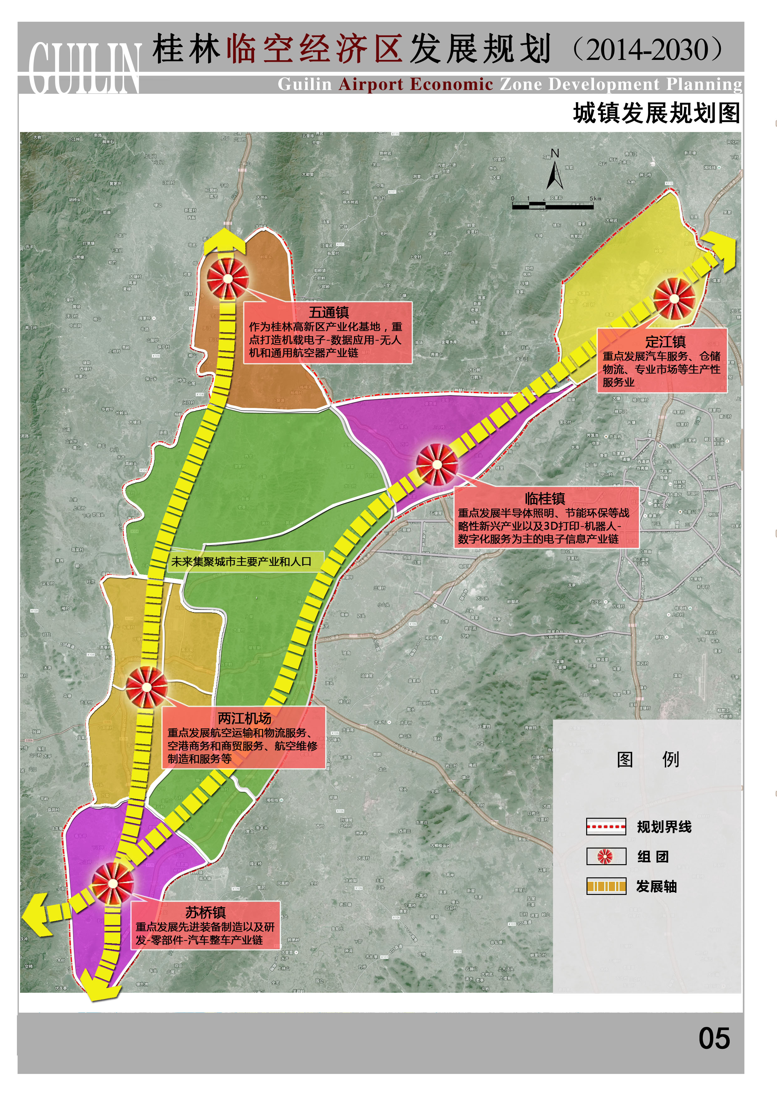 依托207省道和桂柳高速,串联苏桥镇、两江镇和两江机场、五通镇、临桂镇、定江镇,形成分工协作的差异化发展格局,打造一至两个产业特色鲜明的航空小镇。其中,苏桥镇重点发展先进装备制造以及研发-零部件-汽车整车产业链;两江镇和两江机场重点发展航空运输和物流服务、空港商务和商贸服务、航空维修制造和服务等;五通镇作为桂林高新区产业化基地,重点打造机载电子-数据应用-无人机和通用航空器产业链;临桂镇重点发展半导体照明、节能环保等战略性新兴产业以及3D打印-机器人-数字化服务为主的电子信息产业链;定江镇重点发展汽车服务、仓储物流、会议展览、专业市场等生产性服务业。