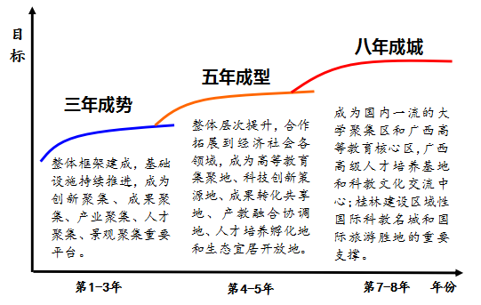 全面实施创新驱动发展战略引领广西新跨越,到2020年初步建成创新型省区,到2030年全面建成创新型省区。2016年9月,全区创新驱动发展大会提出“着力打造南宁、桂林两个高水平大学集聚区”“按照‘两极带动,多点突破’的发展思路,强化南宁、桂林两市作为高水平大学聚集区的引领作用,建设好南宁教育园区,完善桂林高校集中区配套设施”。《中共广西壮族自治区委员会 广西壮族自治区人民政府关于实施创新驱动发展战略的决定》(桂发〔2016〕23号)明确提出要“重点建设南宁、桂林两个高水平高校集聚地”。2016年11月,中国共产党广西壮族自治区第十一次代表大会再次明确提出“加快建设南宁、桂林两个高等教育集聚区”。为加快推进广西壮族自治区高等教育事业发展,增强高等教育服务经济社会发展的能力,自治区党委、政府于2015年、2016年相继启动了南宁教育园区、桂林高校集聚区建设工作。2017年12月,广西举行南宁教育园区、桂林高校集聚区建设新闻发布会,自治区重点支持桂林高校集聚区基础设施建设项目7个,估算项目总投资65.78亿元。