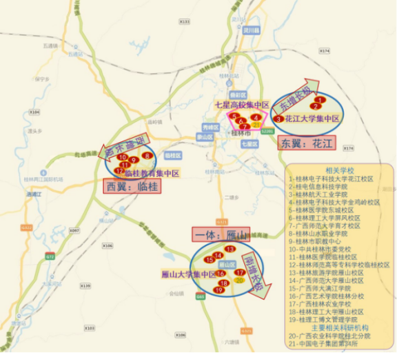 桂林大学聚集区指以桂林市高等教育及相关产业融合发展为支撑,空间集聚特征鲜明、产业空间与城市空间开放互促的功能性区域。