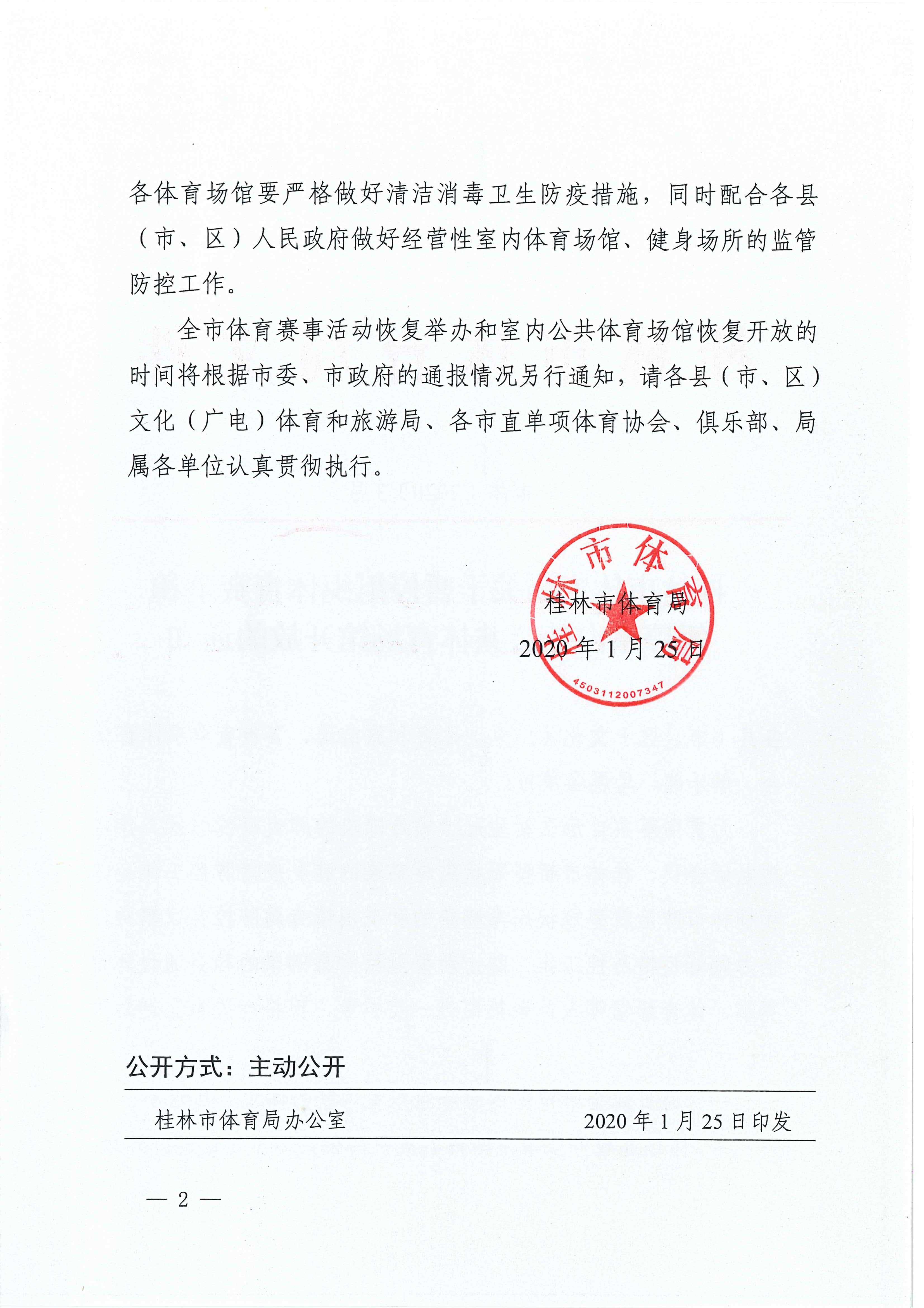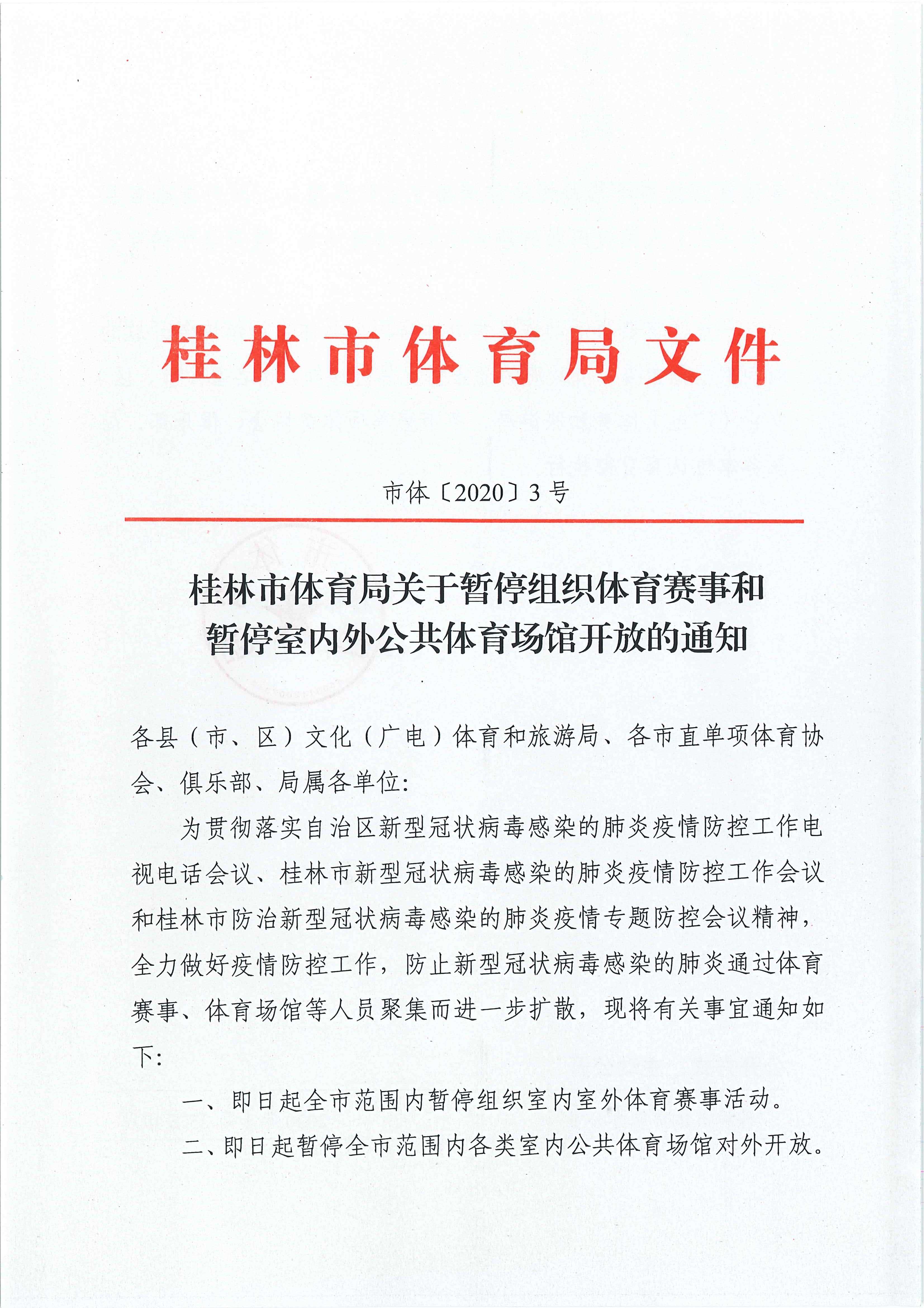 市体〔2020〕3号 桂林市体育局关于暂停组织体育赛事和暂停室内外公共体育场馆开放的通知
