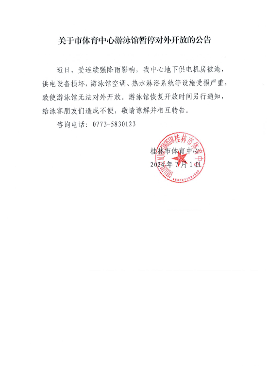 关于市体育中心游泳馆暂停对外开放的公告