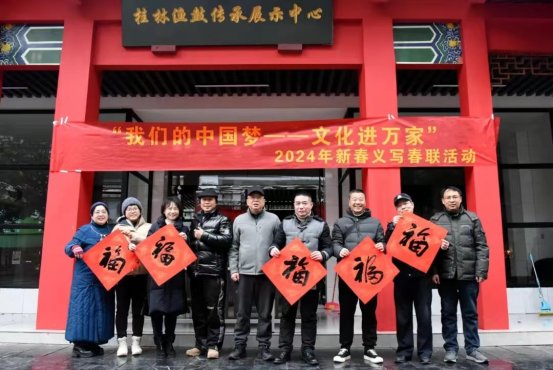 当日,在正阳步行街我馆桂林渔鼓传承展示中心大门前,馆领导龙建忠、韦海涛、黄宏辉和馆书法教师亲自为市民义写春联。天气虽然寒冷,但现场忙碌、欢乐的氛围融融,笑容洋溢在领到新春对联的市民脸上。同日,群众艺术馆全体干部职工开展了赏年画活动,馆教师还利用免开课的时间,向到馆上课的广大学员进行了年画知识普及,以及对如何欣赏年画等内容的讲授。