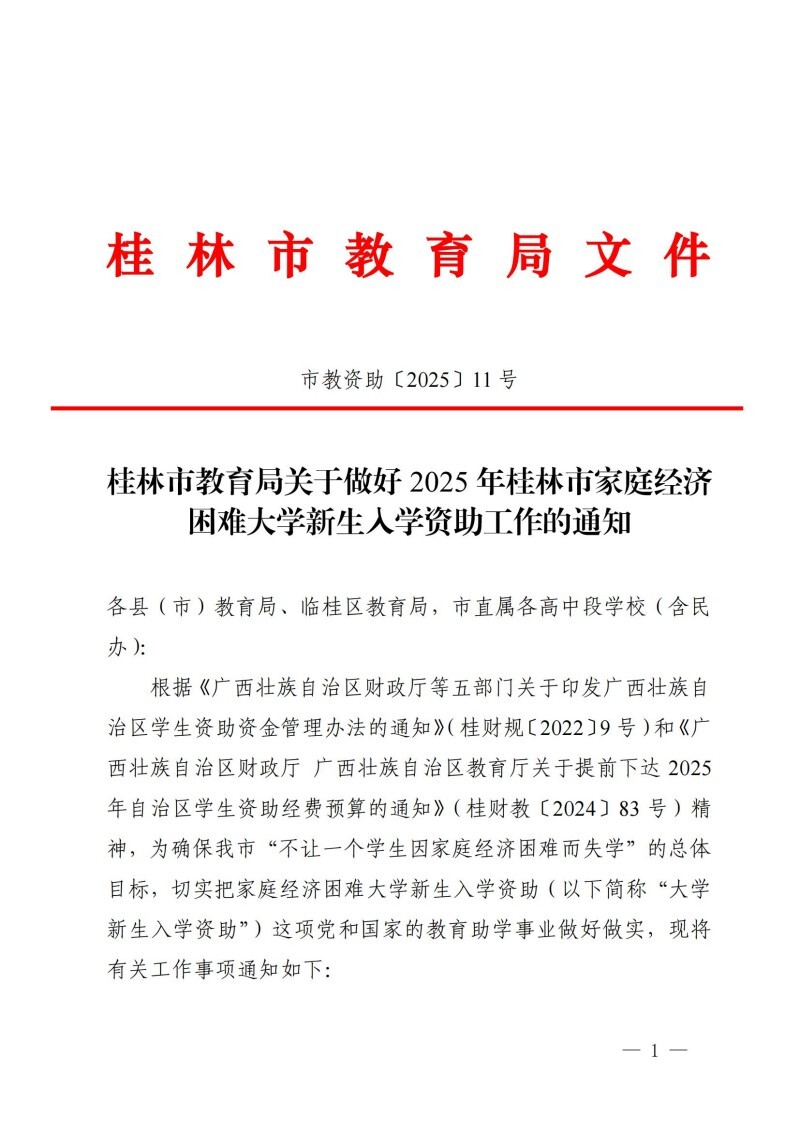 市教资助〔2025〕11 号桂林市教育局关于做好2025年桂林市家庭经济困难大学新生入学资助工作的通知