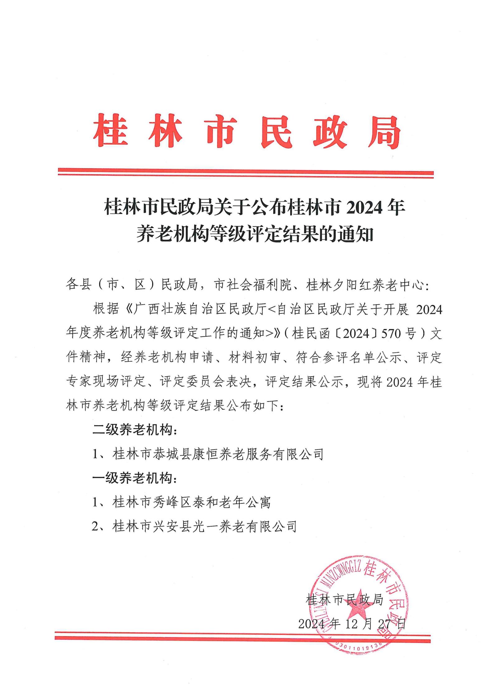 桂林市民政局关于公布桂林市2024年养老机构等级评定结果的通知