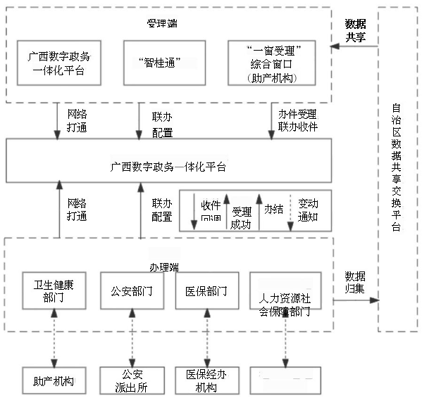 (三)推进系统对接。基于广西数字政务一体化平台应用支撑服务,根据自治区制定的技术对接标准规范,通过与桂妇儿健康服务信息管理系统、人口管理信息系统、医保信息系统、社保卡信息管理系统等对接,实现流程交互、数据流转。支持通过自治区数据共享交换平台获取办事所需材料,加强跨部门业务协同,实现出生“一件事”减材料、减环节、减时间、减跑动。