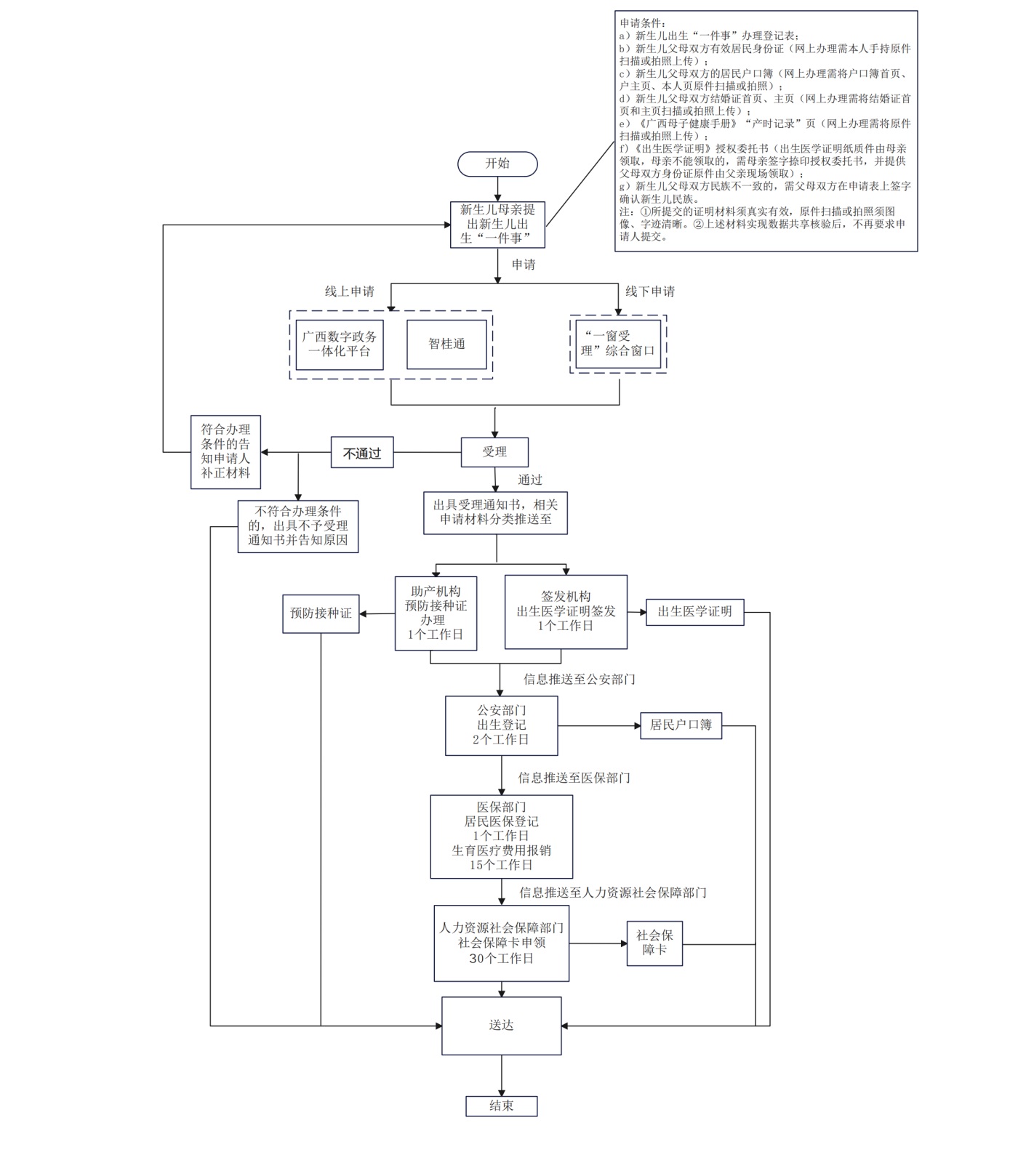 (二)办理方式。线上办理,依托广西数字政务一体化平台和“智桂通”多渠道随时随地网上办理,通过新生儿出生“一件事专区”,采用“智能导引、一表申报、证照免交、信息预填”等智能化方式集成服务,实现“网上办”和“掌上办”。线下办理,在具有《出生医学证明》签发资质的助产机构开设新生儿出生“一件事”综合窗口,实行“一窗受理、集成服务”;无《出生医学证明》签发资质的助产机构要设置新生儿出生“一件事”咨询窗口或咨询台。同时鼓励各地结合实际进行服务渠道拓展、预约快办等创新。