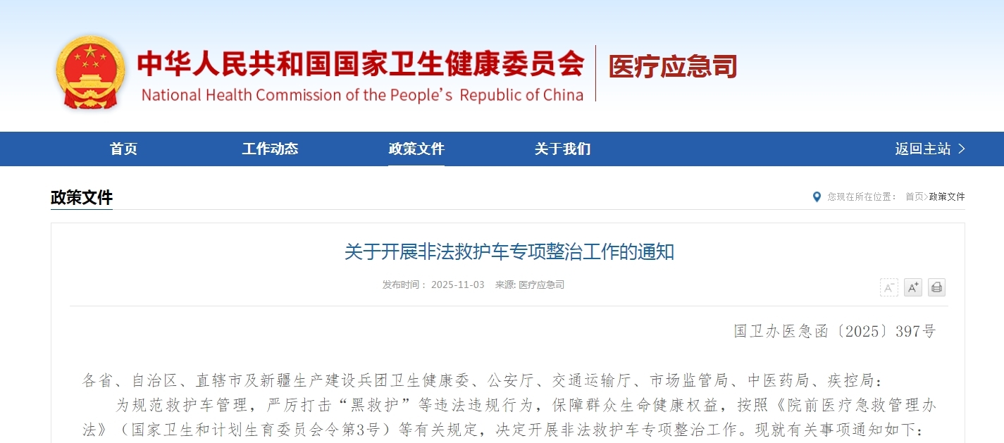 为规范救护车管理,严厉打击“黑救护”等违法违规行为,保障群众生命健康权益,按照《院前医疗急救管理办法》(国家卫生和计划生育委员会令第3号)等有关规定,决定开展非法救护车专项整治工作。现就有关事项通知如下: