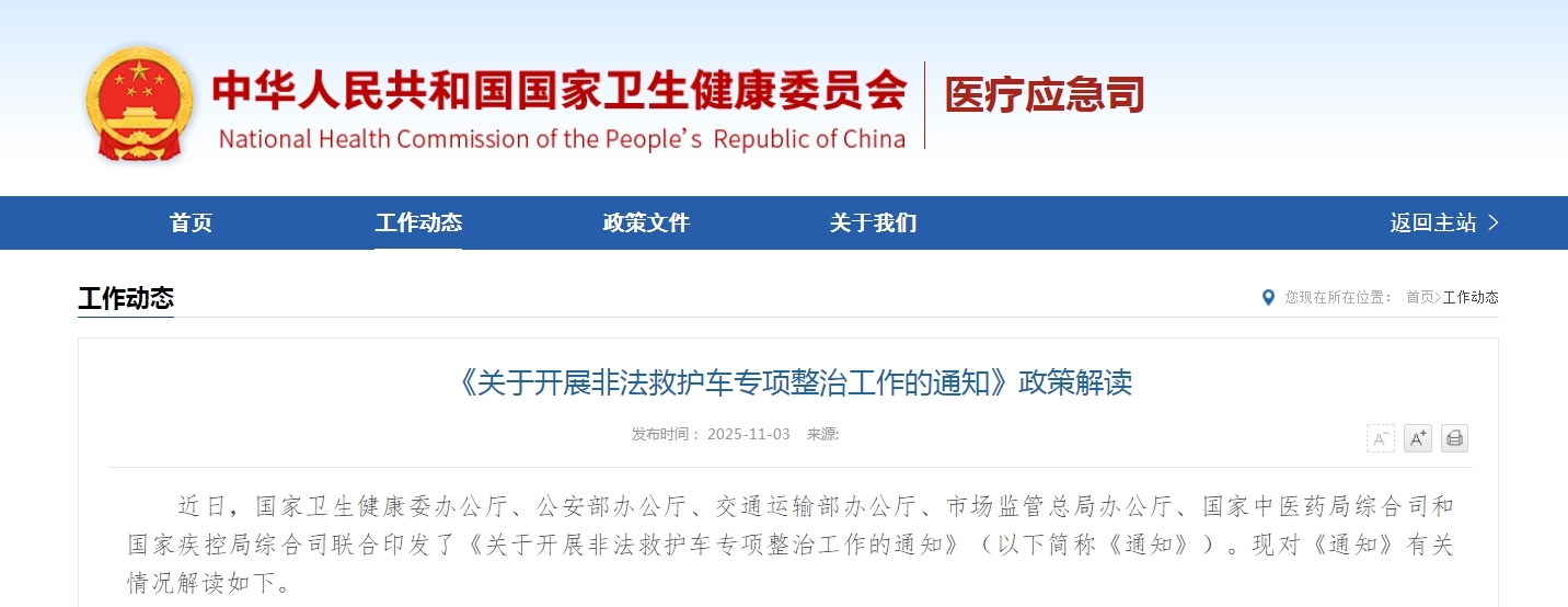近日,国家卫生健康委办公厅、公安部办公厅、交通运输部办公厅、市场监管总局办公厅、国家中医药局综合司和国家疾控局综合司联合印发了《关于开展非法救护车专项整治工作的通知》(以下简称《通知》)。现对《通知》有关情况解读如下。