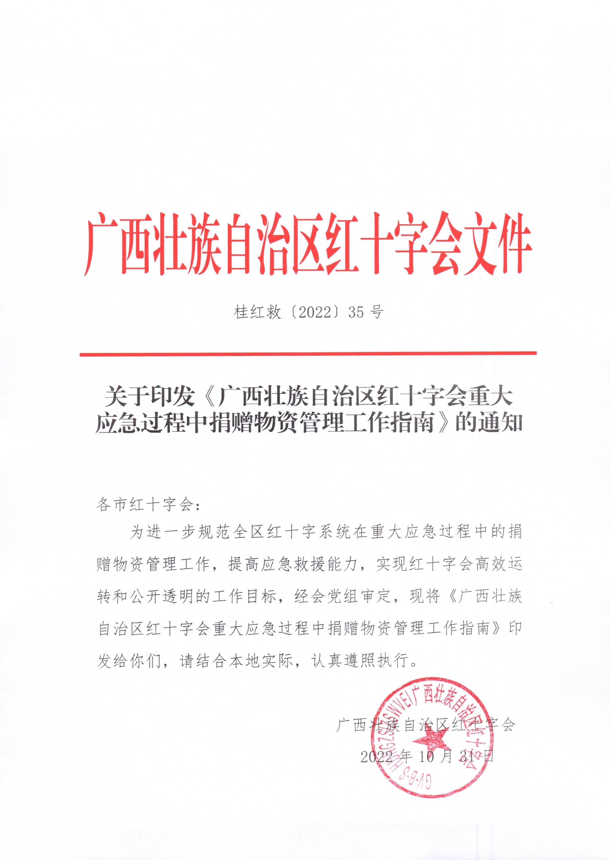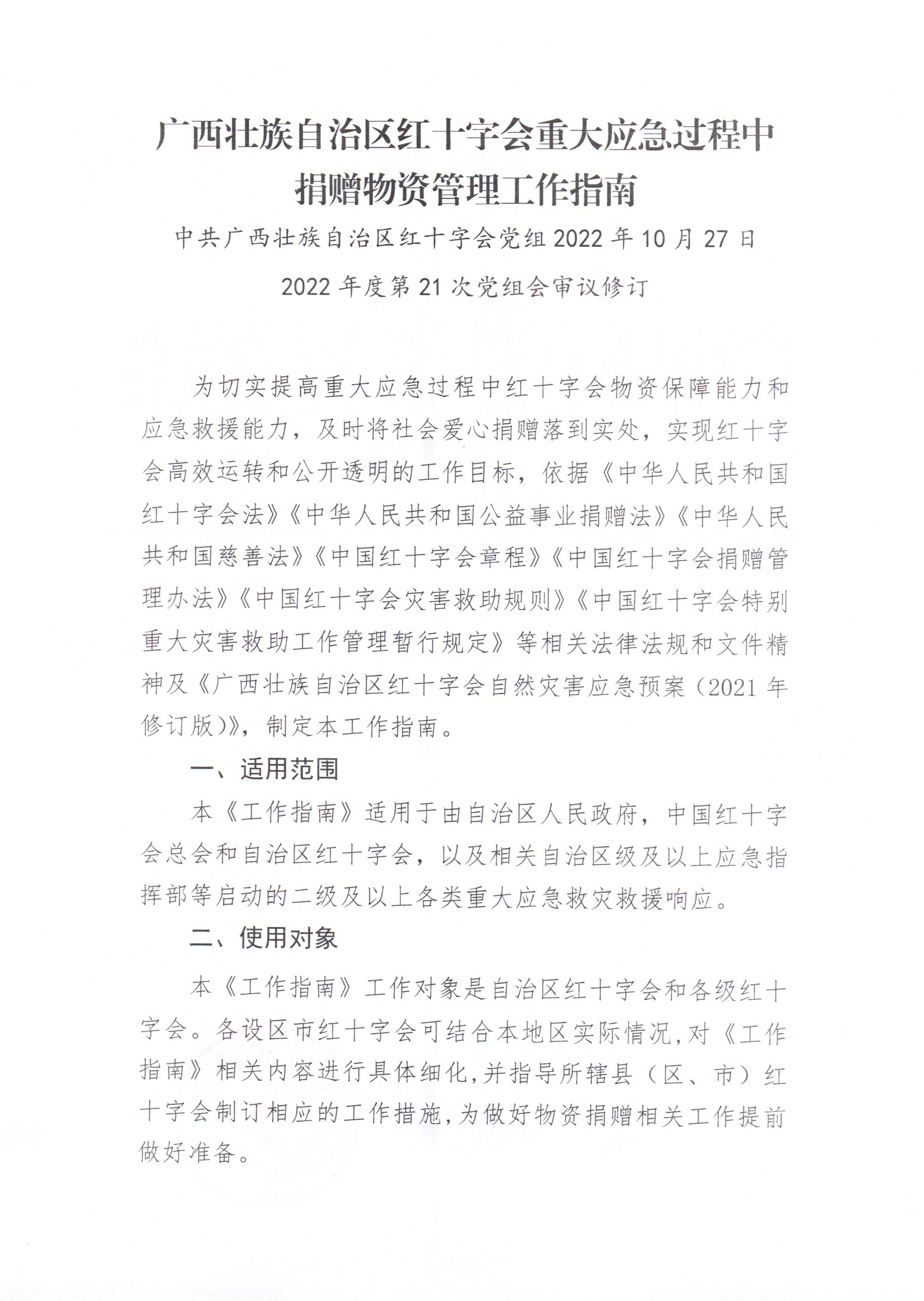 关于印发广西壮族自治区红十字会重大应急过程中捐赠物资管理工作指南的通知