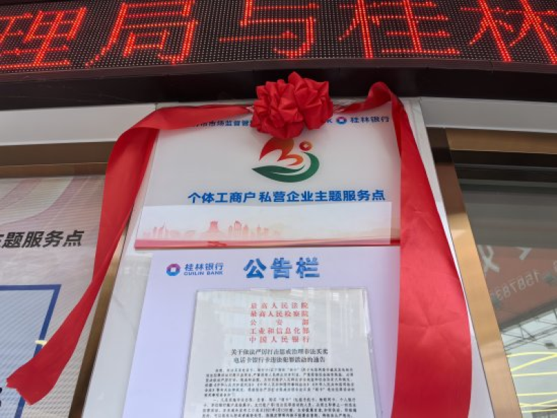 12月6日,由桂林市市场监管局、桂林银行桂林分行共同打造的桂林市首个“个体工商户、私营企业主体服务点”在桂林银行临桂支行揭牌成立。桂林市市场监管局党组成员李琳、临桂区市场监管局副局长覃升喜、桂林银行桂林分行副行长董彦林及相关人员参加揭牌仪式。