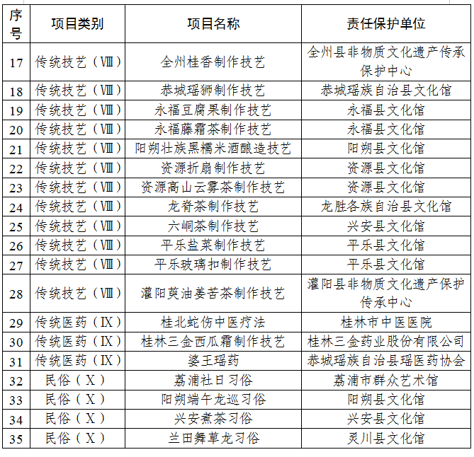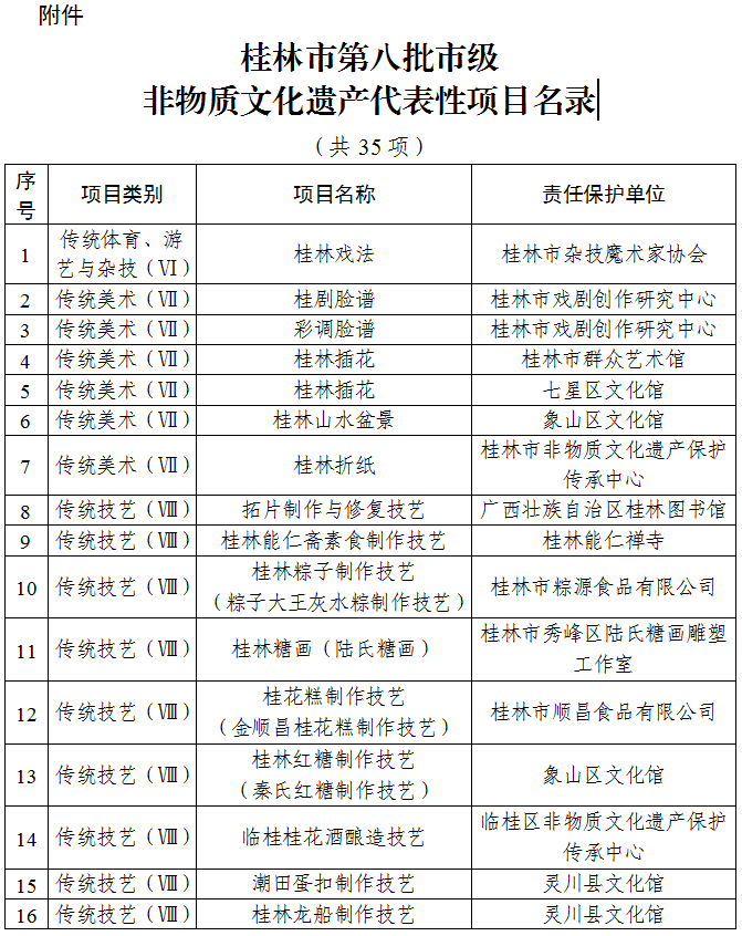 为贯彻落实《中华人民共和国非物质文化遗产法》《广西壮族自治区非物质文化遗产保护条例》和《桂林市人民政府关于加强我市非物质文化遗产保护工作的意见》(市政〔2006〕3号)精神,经专家评审和社会公示,同意将“桂林戏法”等35个项目列入桂林市第八批市级非物质文化遗产代表性项目名录,现予以公布。