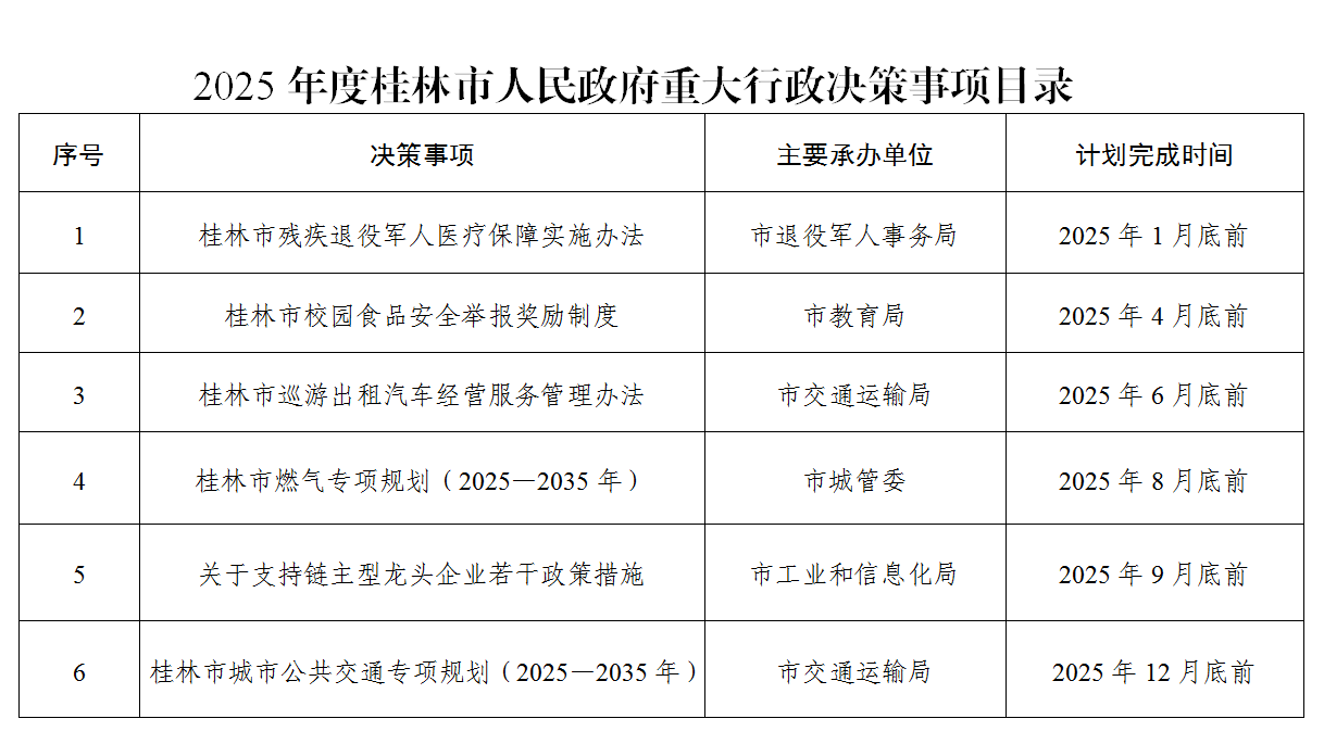 | 标 题:桂林市人民政府办公室关于印发《2025年度桂林市人民政府重大行政决策事项目录》的通知 | |