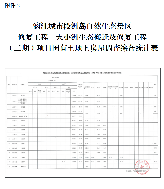 详见《漓江城市段洲岛自然生态景区修复工程—大小洲生态搬迁及修复工程(二期)项目国有土地上房屋调查综合统计表》。