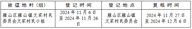 七、被征收土地四至范围内的土地所有权人、使用权人在本公告规定的期限内,持土地权属证书或其他有关证明材料,到指定的地点办理征地补偿登记,请相互转告。如认为征地补偿方案不符合法律、法规规定的,可申请举行听证会,于2024年12月7日之前以村委会为单位,以书面形式送达雁山区人民政府(地址:桂林市雁山区雁中路18号,联系人:邓家阳,联系电话:0773—3550558),逾期未提出意见或听证申请的,视为放弃。