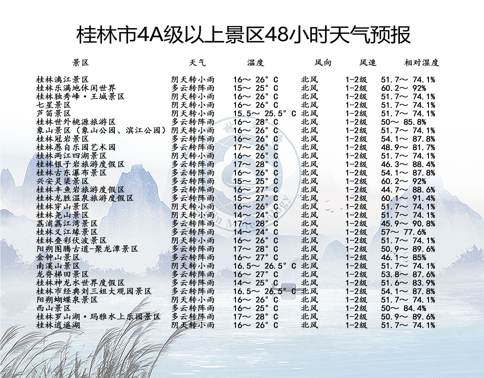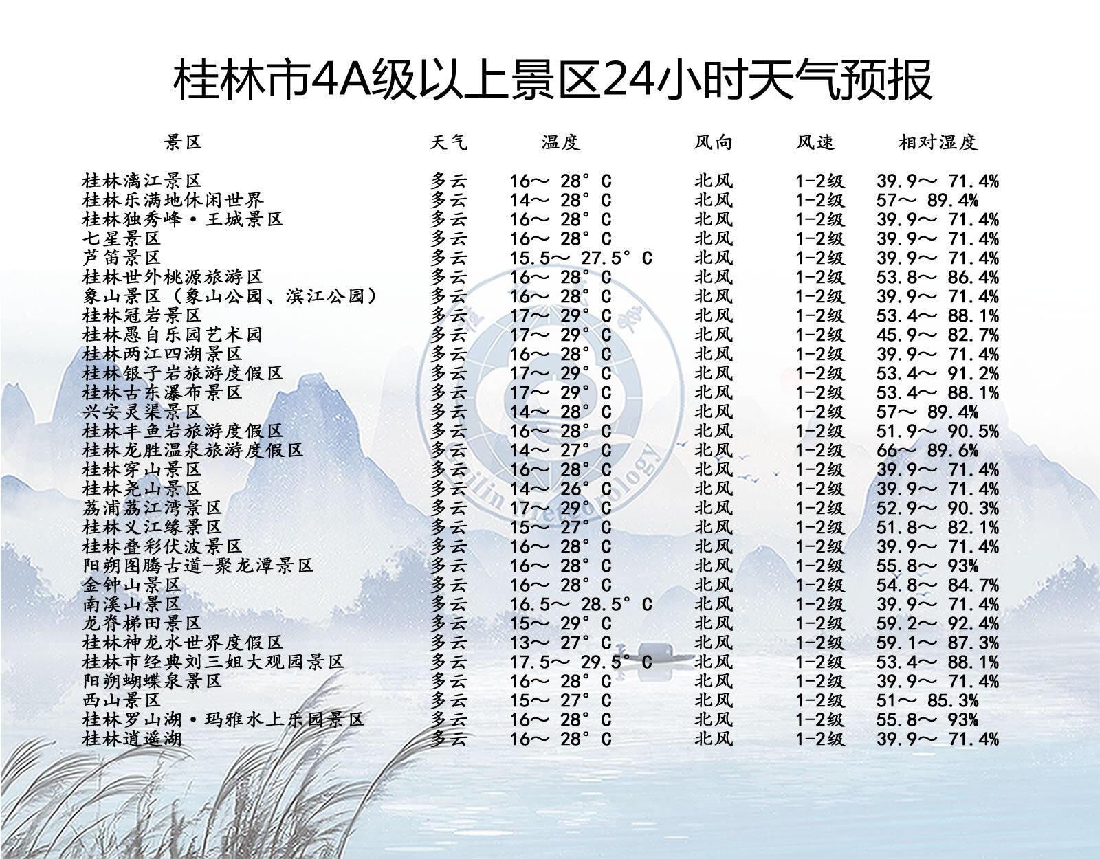 桂林市气象台2026年4月3日16时发布【桂林4A级以上景区24-48小时天气预报】