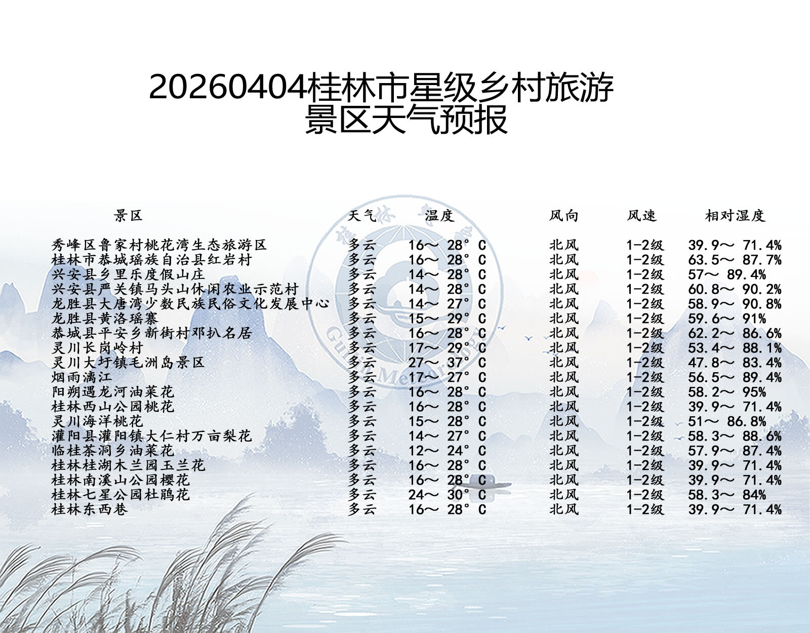 桂林市气象台2026年4月3日16时发布【桂林市星级乡村旅游景点预报】